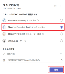 なお、ファイルを添付する際に、メッセージ入力欄の添付ファイルをクリックして、現れる共有の設定画面で「Hiroshima Universityのユーザー」から「現在このチャットに参加しているユーザー」に変更して適用すると、正常に送信できるようです。