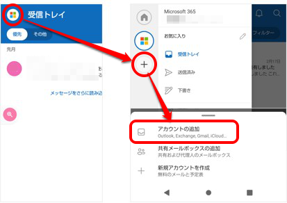 左上の丸いアイコンをタップ、左側に表示される+(またはメールに+がついている)アイコンをタップ、「アカウントの追加(または、メールアカウントの追加)」をタップします。