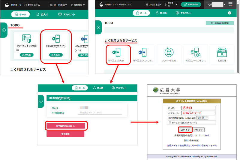 「ホーム」画面が開いたら、”TODO” または、”よく利用されるサービス“の「MFA設定(広大ID)」をクリックし、再度「MFA設定(広大ID)」をクリック、広大IDとパスワードを入力してログインします。- 「MFA設定(広大ID)」の画面は、左端の「三角