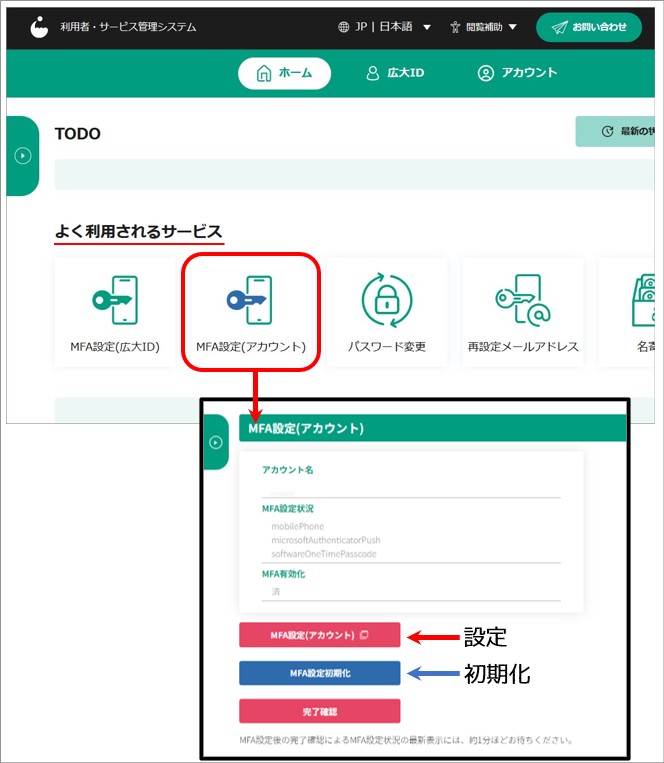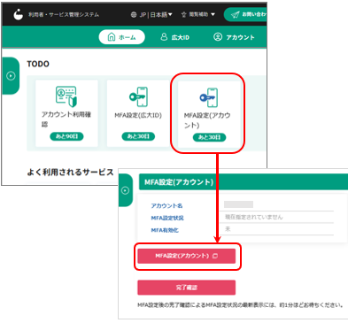 - 「ホーム」画面の ” TODO ” に「MFA設定(アカウント)」が表示されいたらクリックし、再度「MFA設定(アカウント)」をクリックしてください。