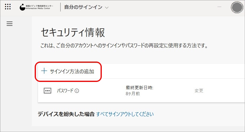 - 「セキュリティ情報」のページの「+サインイン方法の追加」をクリックします。
