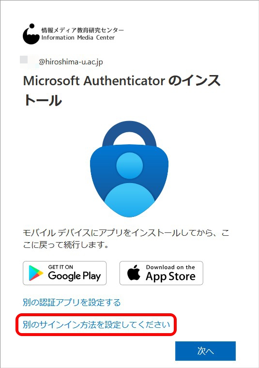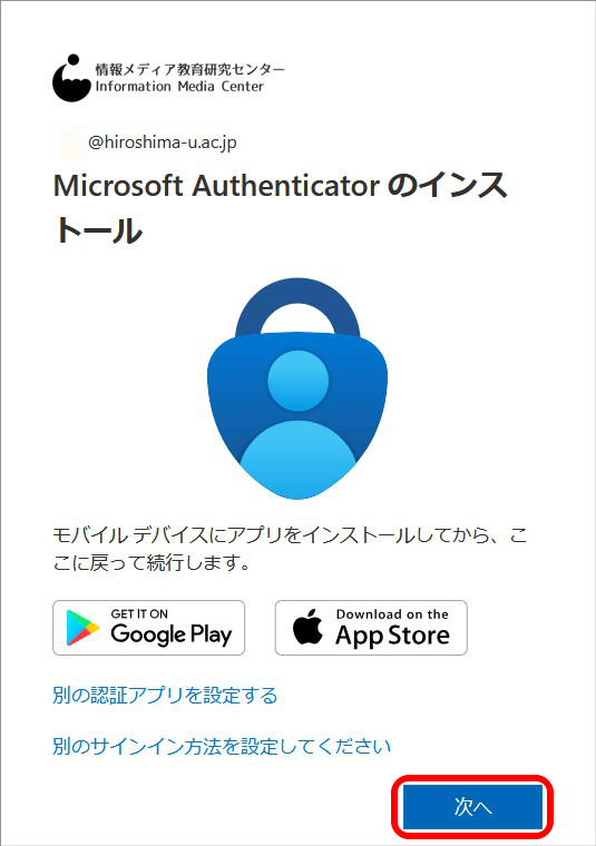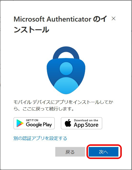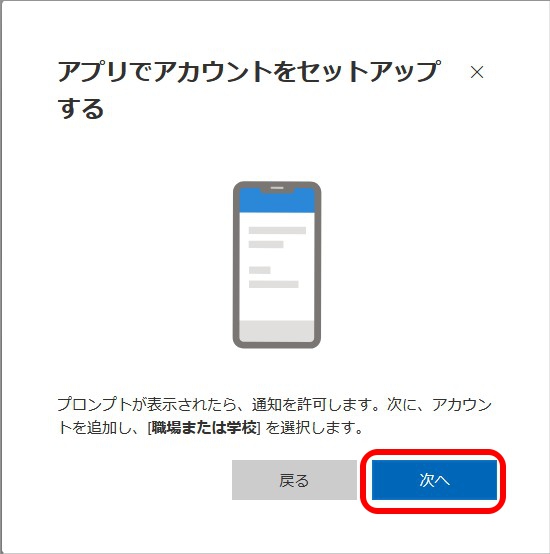 - アプリでアカウントをセットアップする画面が表示されたら「次へ」をクリックします。