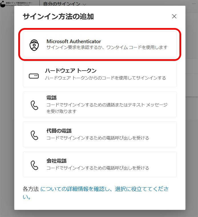 - 方法を選択する画面になりますので、「Microsoft Authenticator」をクリックします。