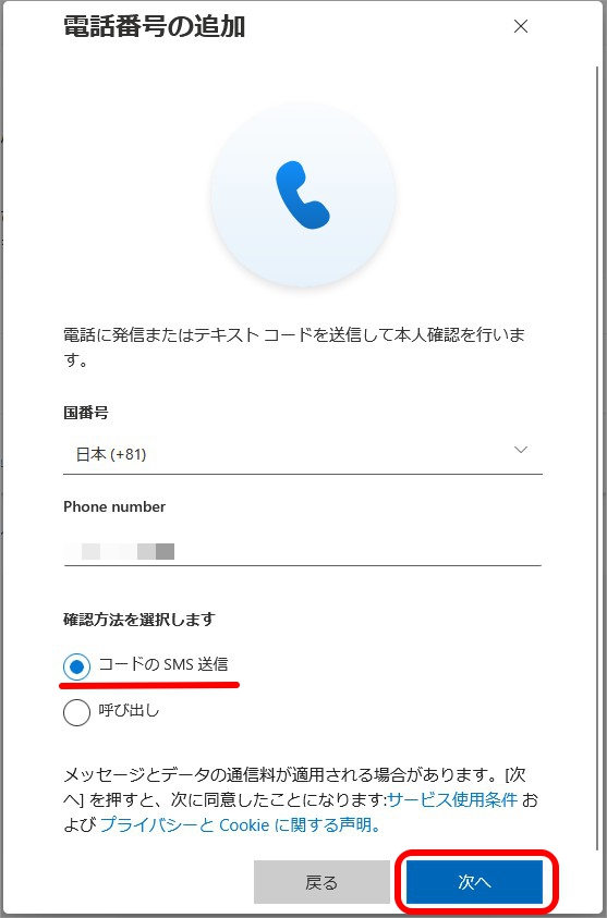 - SMS(ショートメッセージ)で受け取る場合は、「コードのSMS送信」にチェックを入れて「次へ」をクリックします