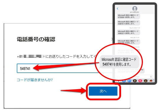 - SMSの場合、ショートメッセージが届きますのでメッセージを確認し、届いた6桁のコードを入力して「次へ」をクリックします
