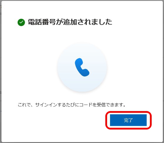 - 操作が完了すると「電話番号が追加されました」が表示されますので「完了」をクリックします。