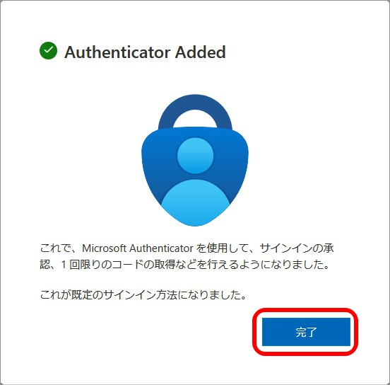 の画面にAuthenticatorが追加されましたと表示がされたら「完了」をクリックします。