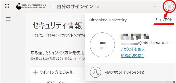 - Microsoft365の「セキュリティ情報」のページにIMCアカウント@hiroshima-u.ac.jp と パスワードでサインインします