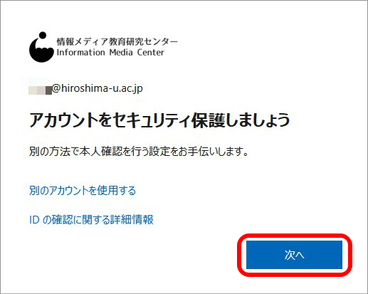 - Microsoft365の「セキュリティ情報」のページに、IMCアカウント@hiroshima-u.ac.jp と パスワードでサインインする