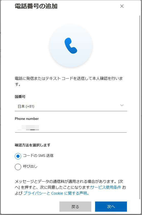 - コードを受け取る電話番号の契約をしている「国」を選択し「 電話番号 」を入力します。(登録する電話番号は、日本でも通話できる番号にしてください)