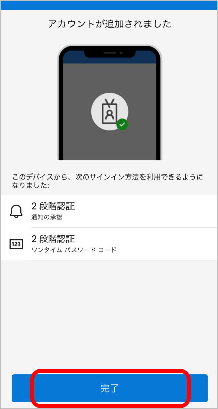 - 「アカウントが追加されました」の画面が表示されたら「完了」をタップします