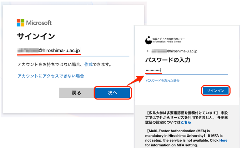 • IMCアカウント@hiroshima-u.ac.jp とパスワードでサインインしてください(IMCアカウントについては、こちら