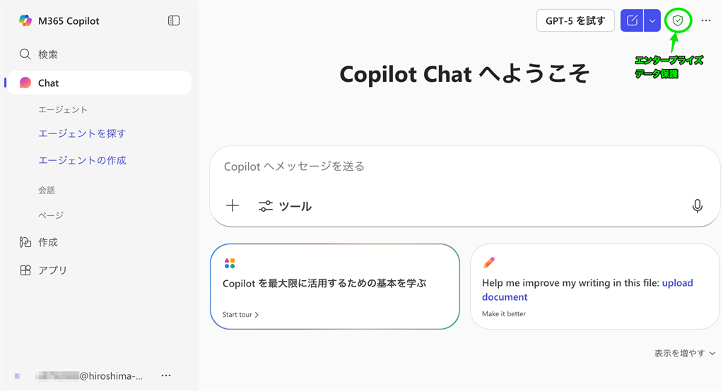 3. M365 Copilot の Chat の画面が開きましたら、右上の緑の盾アイコン「 エンタープライズデータ保護」のアイコンがあることを確認してください