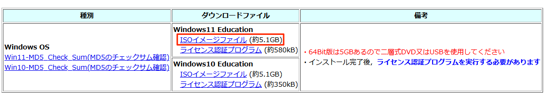 - 画面最下部にある Windows OS の Windows11 Education のISOイメージファイルのリンクをクリックし,必要事項を入力して,ISOイメージファイルをダウンロードする。