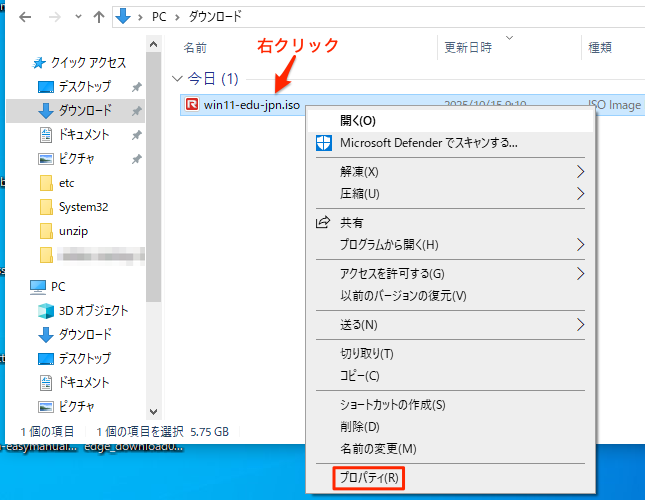- ダウンロードしたファイルの上で右クリックし,プロパティをクリックする。