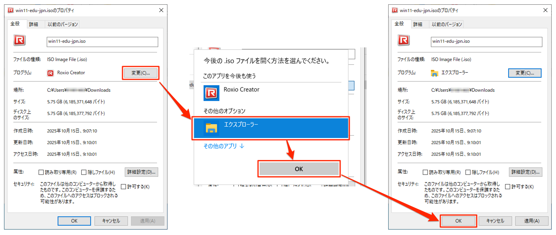 - 「全般」タブのプログラムがエクスプローラー以外のものになっている場合は,[変更] をクリックし,エクスプローラーを選択して [OK] し,元の画面でプログラムがエクスプローラーに変更されていることを確認して,[OK] をクリックする。