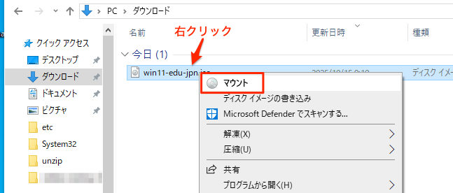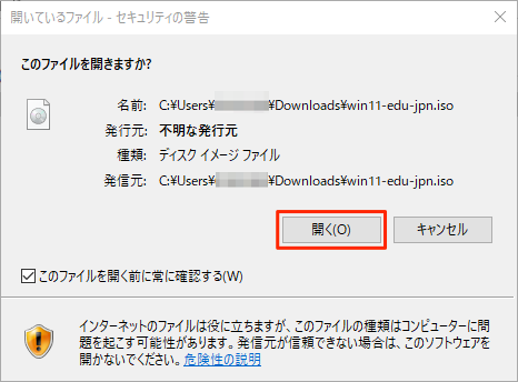 - 再度ファイルの上で右クリックして マウント をクリックし,セキュリティ警告が表示されたら [開く] をクリックする。