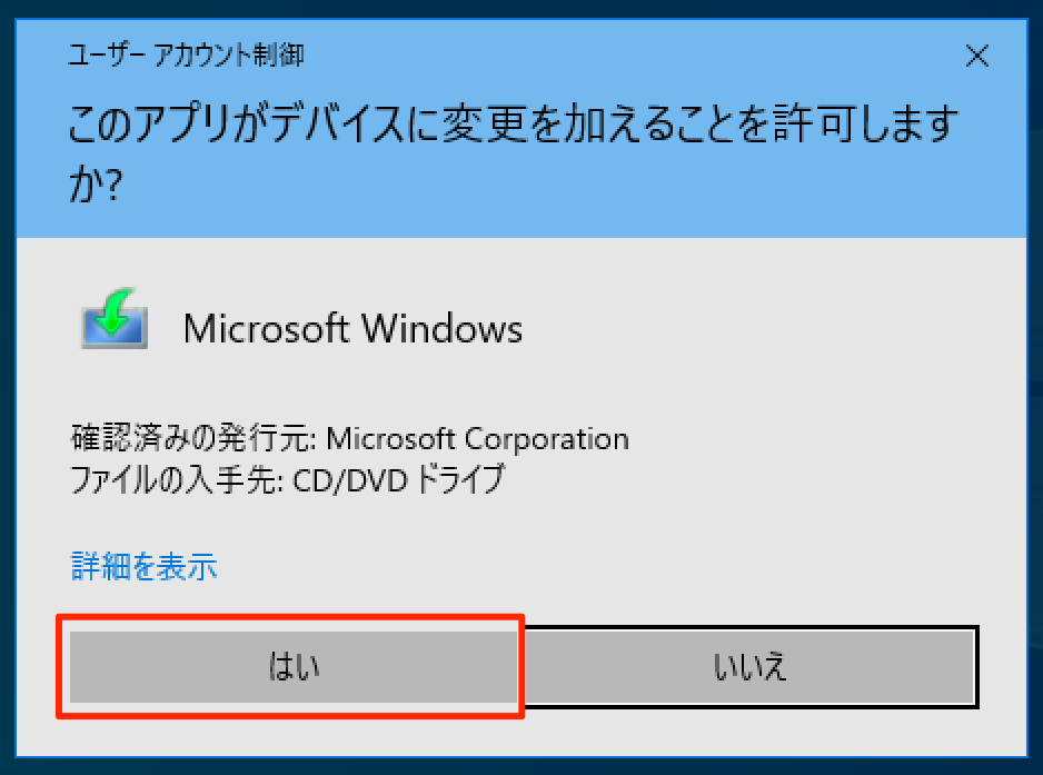 - マウントした画面の「setup.exe」をダブルクリックし,「このアプリがデバイスに変更を加えることを許可しますか?」で [はい] をクリックする。