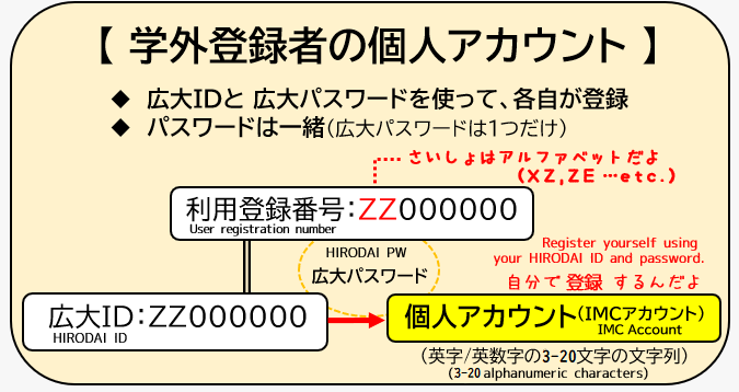 学外者の方で(全学統一ID基盤に学外者として)広大IDを登録されている方は、IMCアカウント(個人アカウント)を取得できる場合があります。