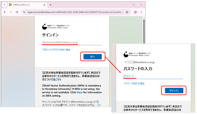 - IMCアカウント@hiroshima-u.ac.jpと広大パスワードでサインインしてアクセスします。